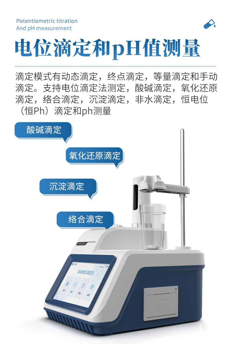 自動電位滴定儀是一種用于化學分析的精密儀器,他通過自動添加滴定劑來確定樣品中特定成分的濃度。該儀器基于電位滴定原理工作,即根據在滴定過程中電池電動勢的變化來確定滴定終點的一款滴定設備。設備滿足國家檢定規(guī)程JJG 814-2015《自動電位滴定儀》儀器級別中的0.05級別,即儀器**示值誤差為±1.5%,儀器示值重復性≤0.2%