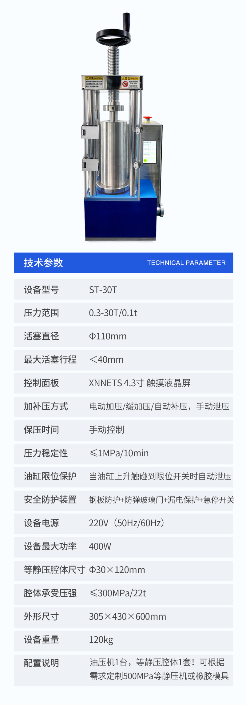 | 配置說明 | 油壓機(jī)1臺(tái),等靜壓腔體1套!可根據(jù)需求定制500MPa等靜壓機(jī)或橡膠模具 |