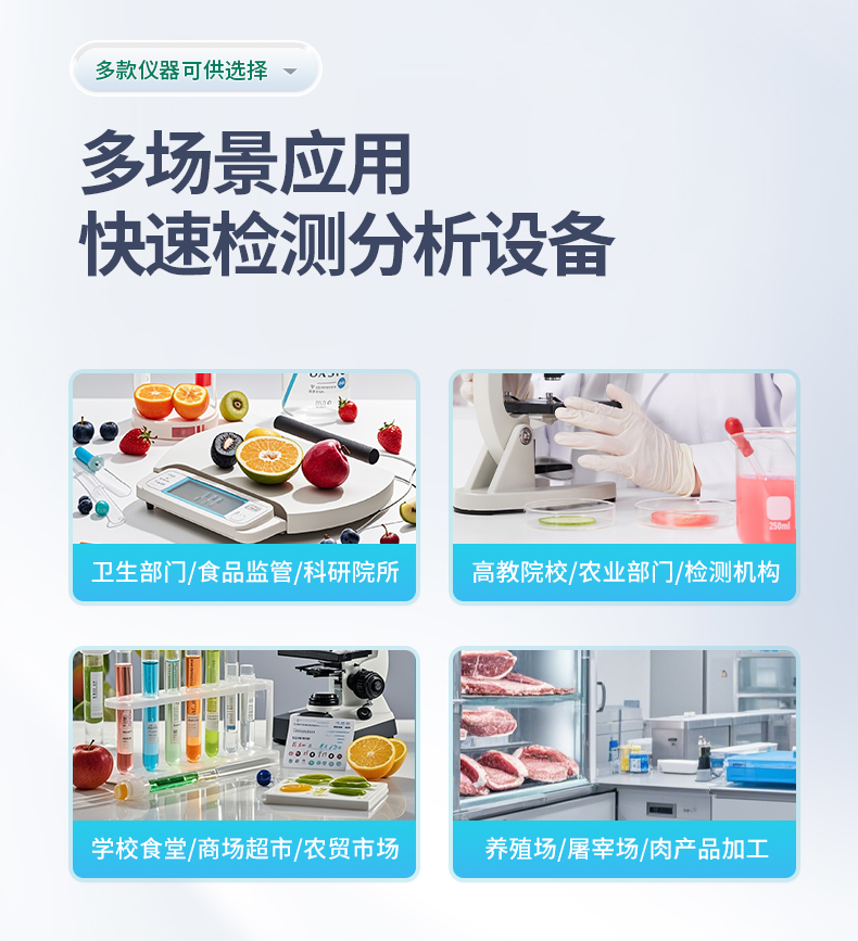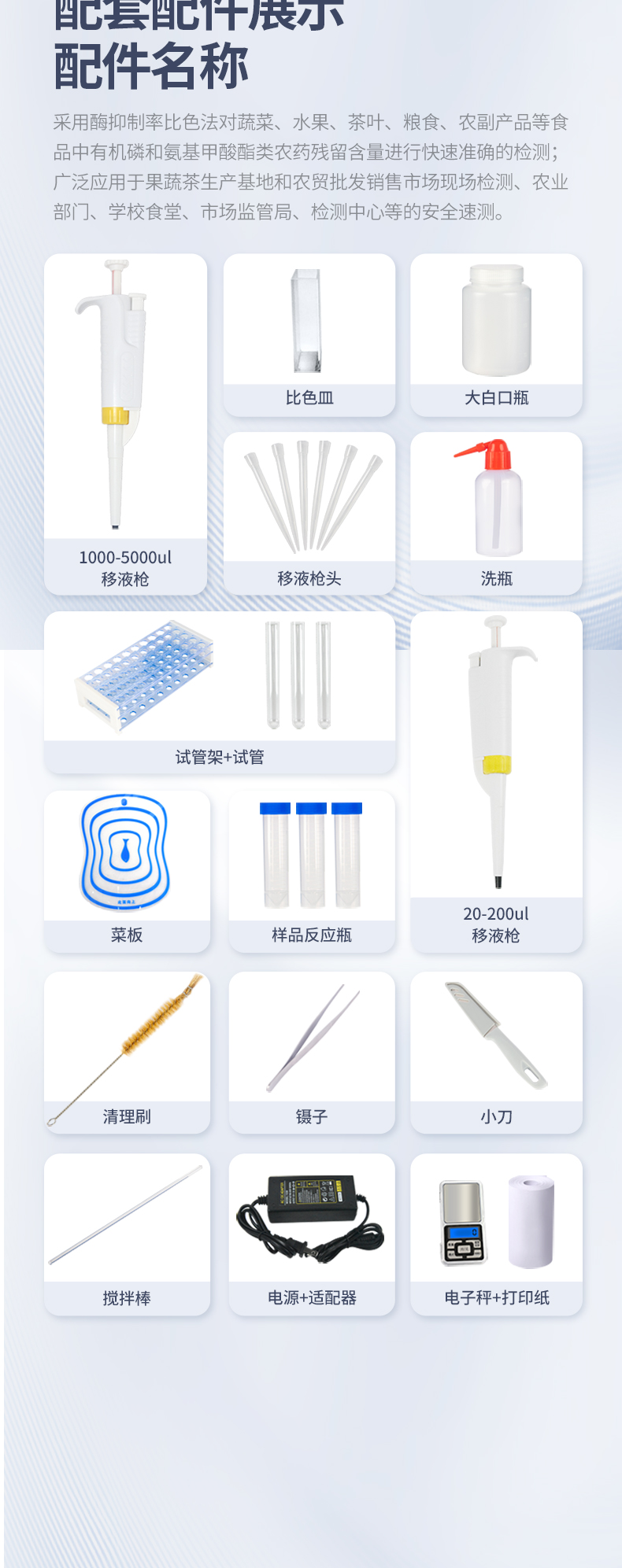 采用酶抑制率比色法對蔬菜、水果、茶葉、糧食、農(nóng)副產(chǎn)品等食品中有機(jī)磷和氨基甲酸酯類農(nóng)藥殘留含量進(jìn)行快速準(zhǔn)確的檢測;廣泛應(yīng)用于果蔬茶生產(chǎn)基地和農(nóng)貿(mào)批發(fā)銷售市場現(xiàn)場檢測、農(nóng)業(yè)部門、學(xué)校食堂、市場監(jiān)管局、檢測中心等的安全速測。