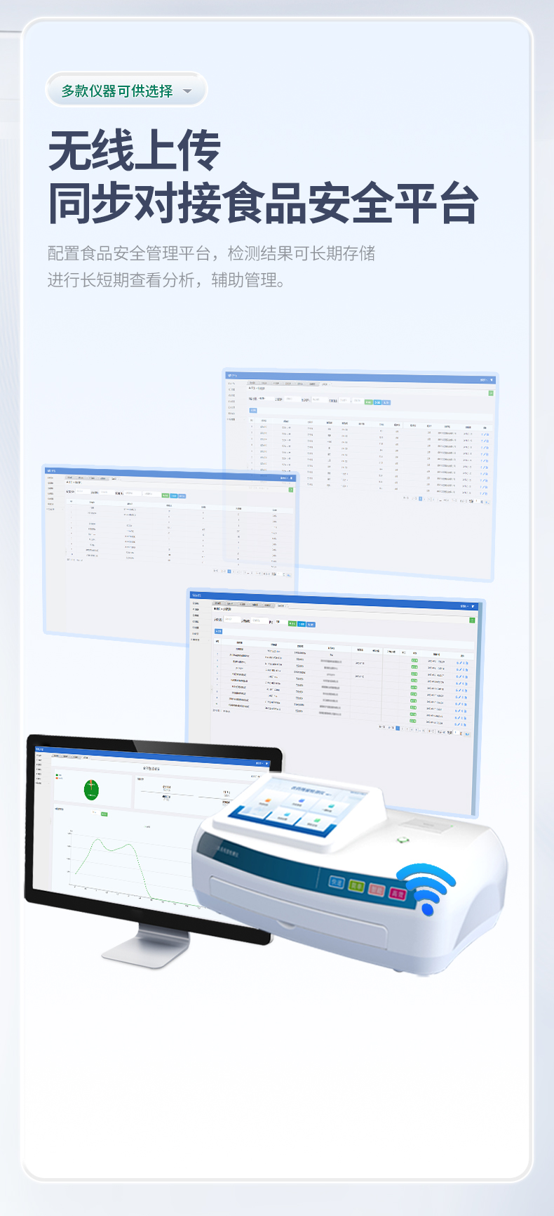 6、配置食品安全管理平臺,檢測結(jié)果可長期存儲,進(jìn)行長短期查看分析,輔助管理。