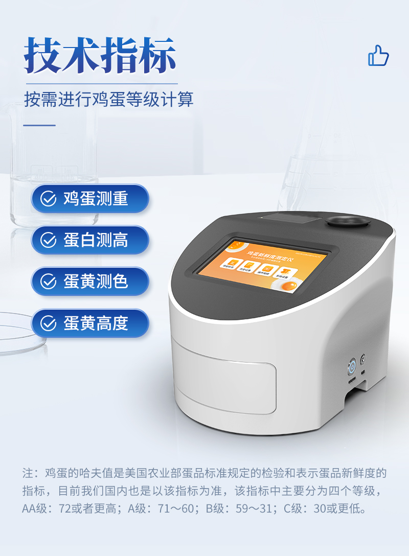 雞蛋品質(zhì)分析儀技術(shù)指標(biāo):雞蛋測重,蛋白測高,蛋黃測色,哈夫值顯示,蛋黃高度等,可進行雞蛋等級計算。雞蛋的哈夫值是美國農(nóng)業(yè)部蛋品標(biāo)準(zhǔn)規(guī)定的檢驗和表示蛋品新鮮度的指標(biāo),目前我們國內(nèi)也是以該指標(biāo)為準(zhǔn),該指標(biāo)中主要分為四個等級,AA級:72或者更高;A級:71~60;B級:59~31;C級:30或更低。