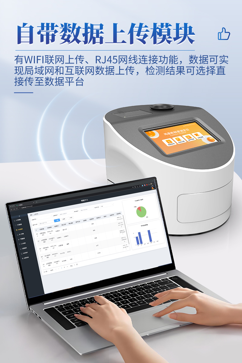7.儀器可本機存儲數(shù)據(jù),可連接USB端口將數(shù)據(jù)導(dǎo)出存儲。另外,儀器自帶數(shù)據(jù)上傳模塊,具有WIFI聯(lián)網(wǎng)上傳、RJ45網(wǎng)線連接功能,數(shù)據(jù)可實現(xiàn)局域網(wǎng)和互聯(lián)網(wǎng)數(shù)據(jù)上傳,檢測結(jié)果可選擇直接傳至數(shù)據(jù)平臺,進行大數(shù)據(jù)分析處理與數(shù)據(jù)統(tǒng)計,達到長期分析監(jiān)測的目的。