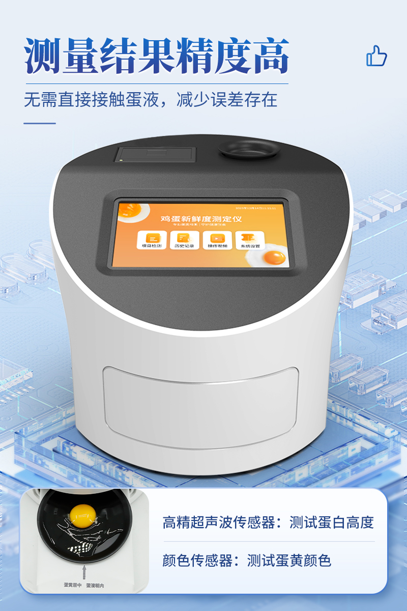 4.創(chuàng)新采用高精超聲波傳感器測試蛋白高度,精密傳感器測試蛋黃顏色,無需直接接觸蛋液,減少誤差存在。