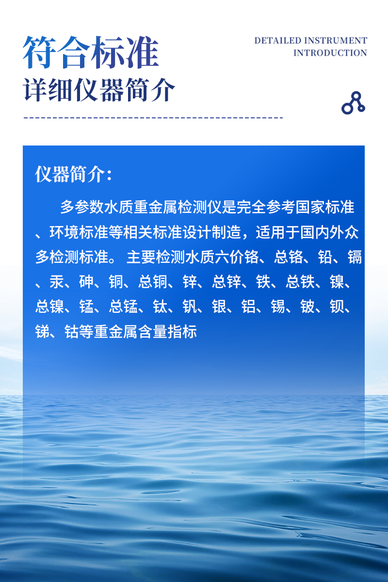 多參數(shù)水質(zhì)重金屬檢測(cè)儀是完全參考國(guó)家標(biāo)準(zhǔn)、環(huán)境標(biāo)準(zhǔn)等相關(guān)標(biāo)準(zhǔn)設(shè)計(jì)制造,適用于國(guó)內(nèi)外眾多檢測(cè)標(biāo)準(zhǔn)。 主要檢測(cè)水質(zhì)六價(jià)鉻、總鉻、鉛、鎘、汞、砷、銅、總銅、鋅、總鋅、鐵、總鐵、鎳、總鎳、錳、總錳、鈦、釩、銀、鋁、錫、鈹、鋇、銻、鈷等重金屬含量指標(biāo);本儀器兼具智能數(shù)據(jù)分析功能,圖表、列表顯示數(shù)據(jù),分析一目了然;高清晰度彩色液晶觸摸顯示屏,Android智能操作系統(tǒng),中文顯示界面,中英文鍵盤(pán),人性化操作,使用更簡(jiǎn)單。